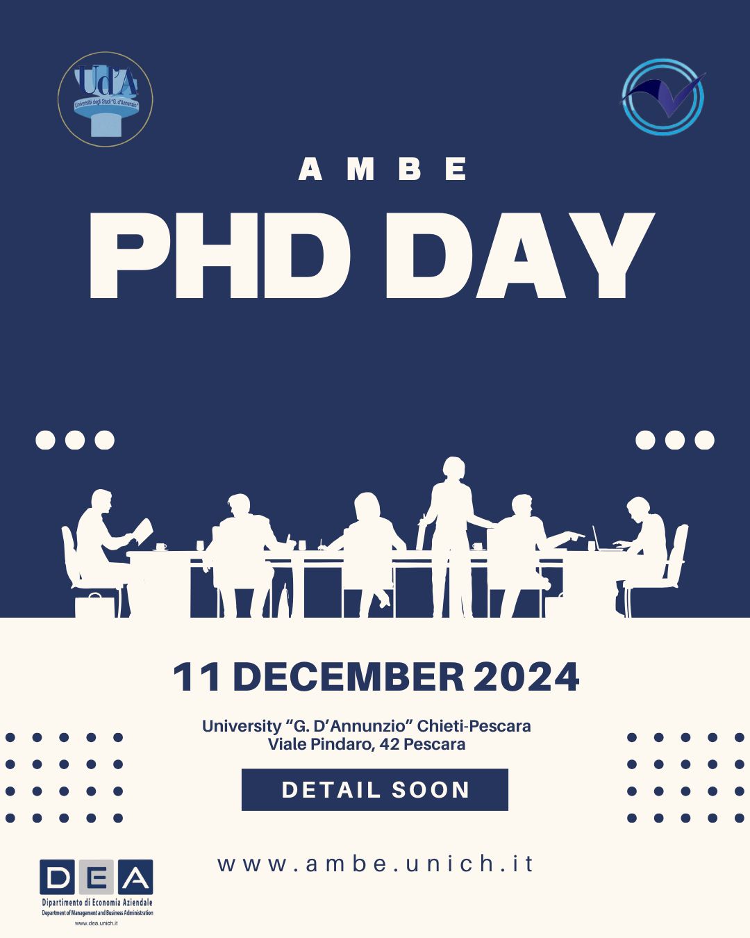 L’AMBE PhD Day è una giornata dedicata alla comunità del dottorato, pensata come momento di incontro, condivisione e confronto sulle attività e sui progetti di ricerca. L’evento si svolgerà l’11 dicembre 2024 presso l’Università “G. d’Annunzio” Chieti-Pescara, sede di Viale Pindaro 42, Pescara.